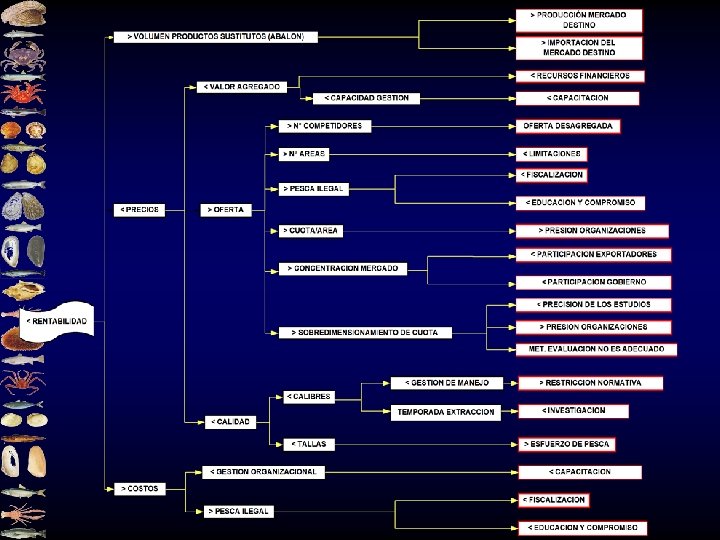 ¿Cuales son las posibles causas de la baja rentabilidad? • El siguiente diagrama, se basa en determinar las posibles causas de la menor rentabilidad. • Es un esquema preliminar, que debe ser discutido. • Ayuda a reconocer los factores claves, para abordarlos y revertir la situación planteada.