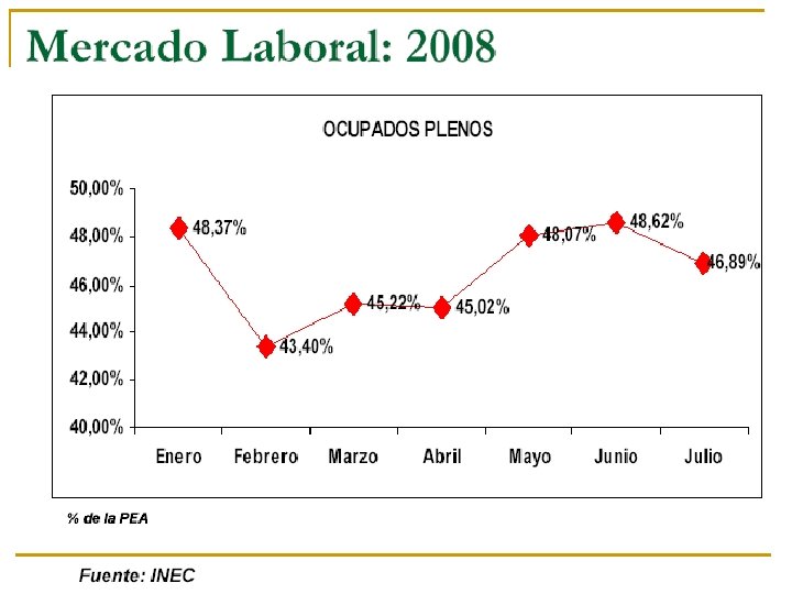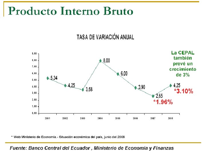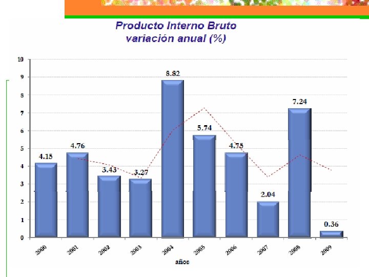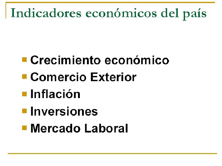 INDICADORES ECONÓMICOS n n n n n PIB: tasa anual de crecimiento Población: tasa anual de crecimiento Inversión: proporción del PIB Inversión pública / Inversión total Desocupación: proporción de la PEA Balanza comercial Balanza en cuenta corriente y de capitales Reserva Monetaria Internacional Deuda Externa Tipo de cambio: tasa anual de devaluación