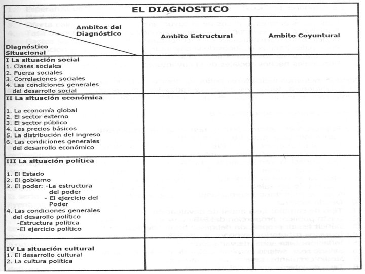 n El diagnóstico debe incluir una exposición sobre el enfoque a partir del cual ha sido formulado. n La sociedad política que incluye los partidos políticos que controlan el poder y los de la oposición. Se diagnostica la correlación política existente.