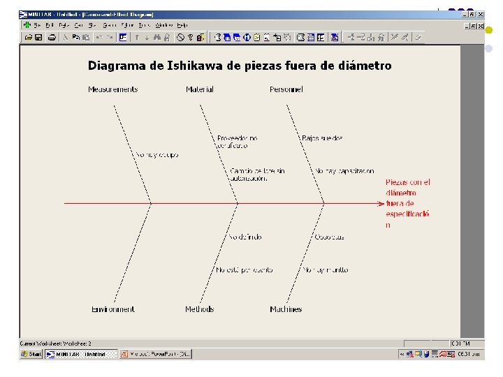 Ejemplo de Diagrama de Ishikawa de Tipo 6 M Métodos de Trabajo Mano de Obra Operario Supervisión Materiales No estandarizado Inadecuado. Fuera de especs. Capacitación Equipo inadecuado Chasis Mntto. Presencia de deficientepolvos Equipo no adecuado. Maquinaria Medio Ambiente Medición