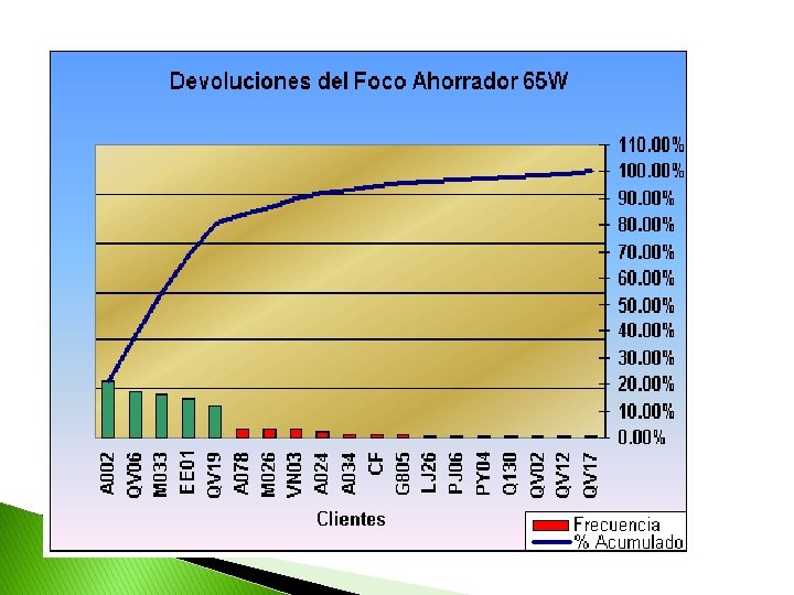 Problema � � � � Encontrar el o los motivos de devoluciones del Foco Ahorrador de 65 W de marca comercial conocida en el año 2005. Total de venta en el año 2005: 1500 unidades Precio del foco para la venta: $8. 90 Total de foco devueltos: 167 unidades. De los 82 clientes directos que adquieren el producto, determinamos que 19 clientes son los que nos han devuelto el producto en el transcurso del año 2005 DEVOLUCIÓN DE FOCO AHORRADOR DE 65 W EN UNIDADES El objetivo del ejemplo es obtener las posibles causas de la devolución del producto, lo cual analizaremos a los 19 clientes de acuerdo al Principio y Diagrama de Pareto.