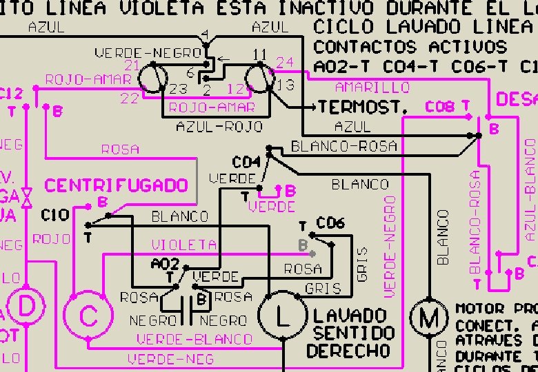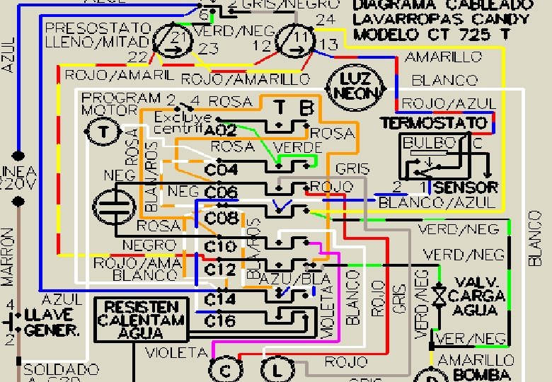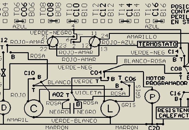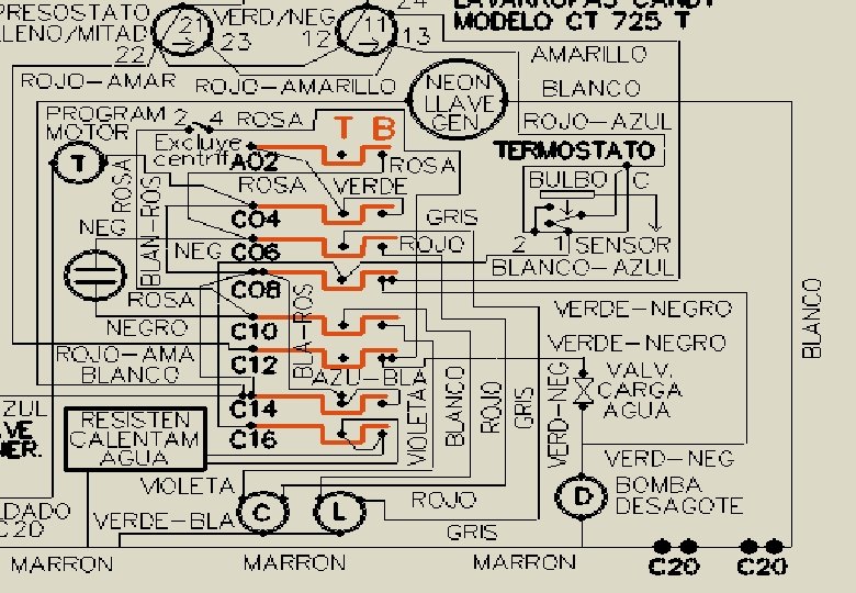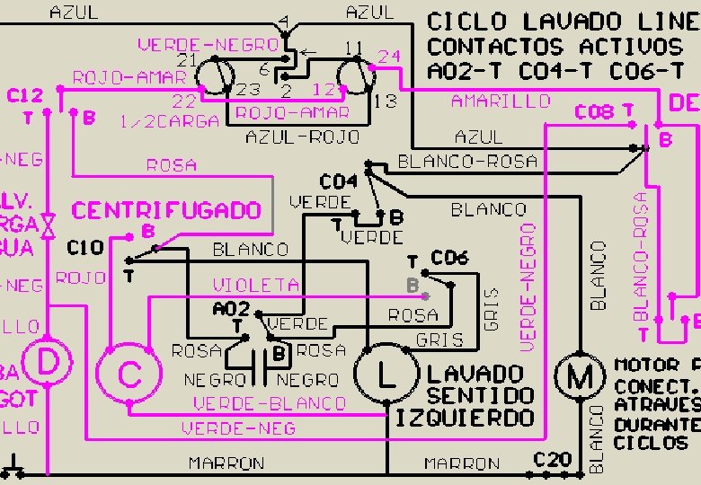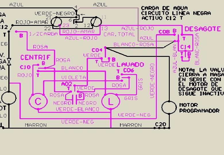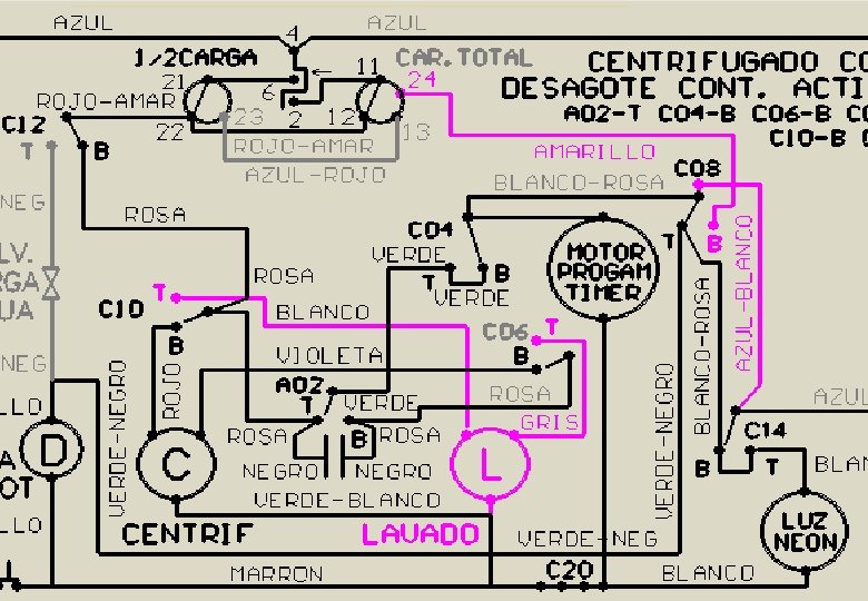 DIAGRAMA ELECTRICO CON PROGRAMADOR ELECTROMECANICO PARA LAVARROPAS PROGRAMADOR CON MOTOR SINCRONICO QUE ACCIONA 8 CONTACTOS MOVILES DENOMINADOS A 02 – C 04 – C 06 - C 08 – C 10 – C 12 – C 14 – C 16 QUE CIERRAN ALTERNATIVAMENTE SOBRE LOS CONTACTOS FIJOS “T” Y “B”