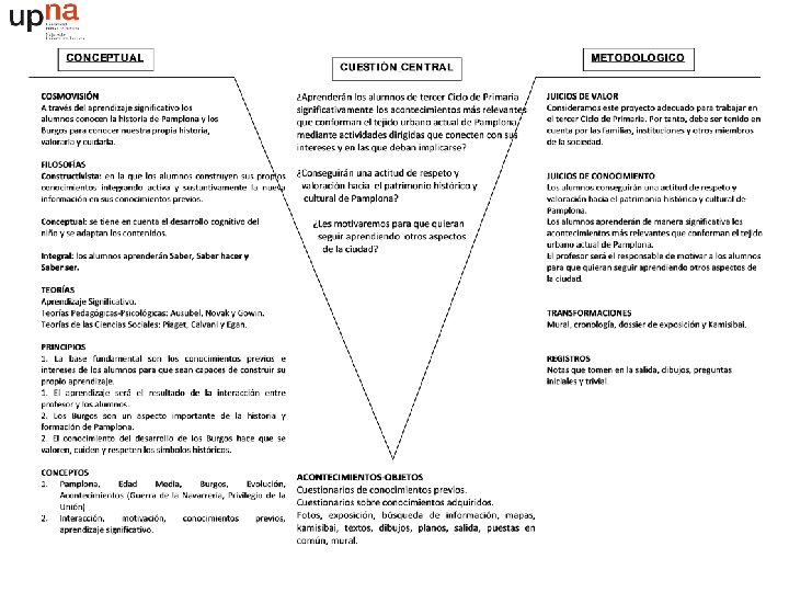 Instrumentos para aprender significativamente: La V de Gowin Conceptual Metodológico COSMOVISION JUICIOS DE VALOR CUESTION / ES CENTRAL / ES FILOSOFIA JUICIOS DE CONOCIMIENTO TEORIA TRANSFORMACIONES PRINCIPIOS REGISTROS CONCEPTOS ACONTECIMIENTOS / OBJETOS