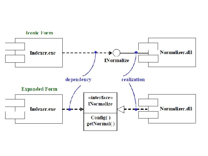 Propiedades de un Componente. 1. Es una parte de un sistema. 2. Es reemplazable. 3. Conforma y proporciona la realización de un conjunto de interfaces. 4. Es una unidad de despliegue independiente. 5. Puede ser conectado con otros componentes. 6. En una aplicación dada existirá una única copia. 7. Realiza una función bien definida (cohesión física y lógica). 8. Abarca más de una colaboración de clases. 9. Existe en el contexto de una arquitectura bien definida. 10. Presupone una infraestructura tecnológica que se piensa utilizar.