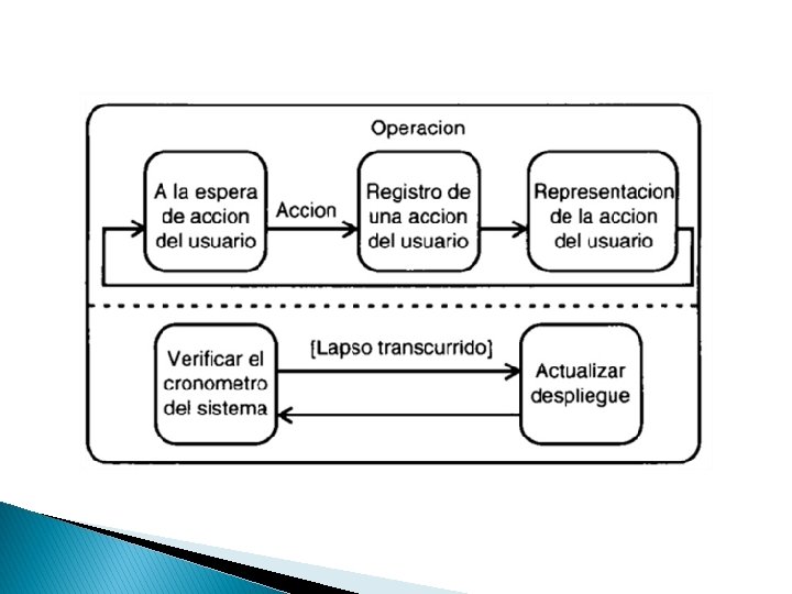 Subestados Concurrentes: � Dentro del estado de operación de la GUI no sólo aguarda a que usted haga algo. También verifica el cronómetro del sistema y (posiblemente) actualiza el despliegue de una aplicación luego de un intervalo específico. Por ejemp. Lo, una aplicación podría incluir un reloj de pantalla que tuviera que actualizar la GUI.