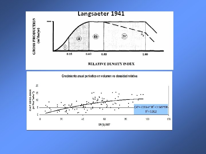 Conclusiones ü Los renovales no siguen el desarrollo propuesto por Langsaeter. Los diagramas clásicos no son aplicables a la especie ü Los renovales alcanzan su máximo crecimiento anual periódico en volumen con la máxima densidad. Estructura díamétrica irregular con asimetría propia del tipo “J” inversa ü Los renovales siguen la ley del -3/2 y la línea de autoraleo debe ajustarse por métodos objetivos (regresión estocástica de frontera o regresión quantil)