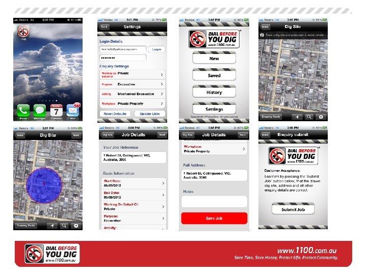 The Service • • • The essential first step in any excavation Lodging an enquiry is free Funded by our Members Enquiries can be lodged online - www. 1100. com. au – 24/7 Dial Before You Dig has a single contact number - 1100 – free call