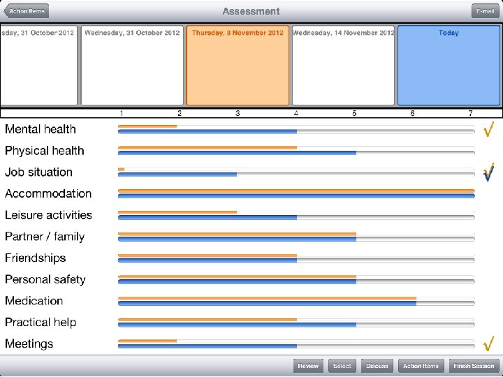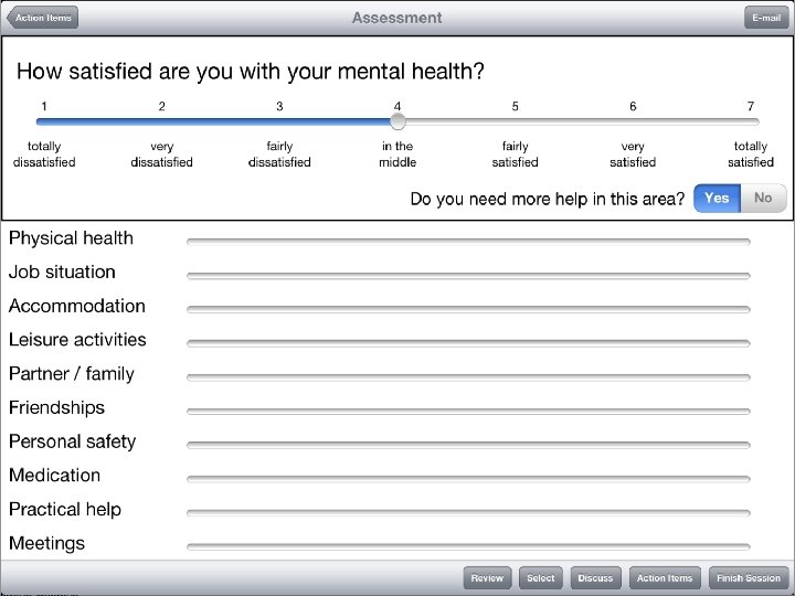 DIALOG • “How satisfied are you with your…” mental health job situation leisure activities friendships medication meetings physical health accommodation partner/family personal safety practical help received • Rating of each domain from 1 -7 • “Do you need additional help? ”