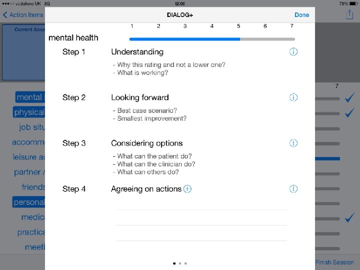 Customising DIALOG app • Enter ‘settings’ on your i. Pad home screen • Enter the DIALOG settings from the list of your apps on the left • Set ‘Additional Help’ and ‘DIALOG+’ to off for basic DIALOG scale • Activate ‘Additional Help’ for extra help question • Activate ‘DIALOG+’ for full solution focused intervention