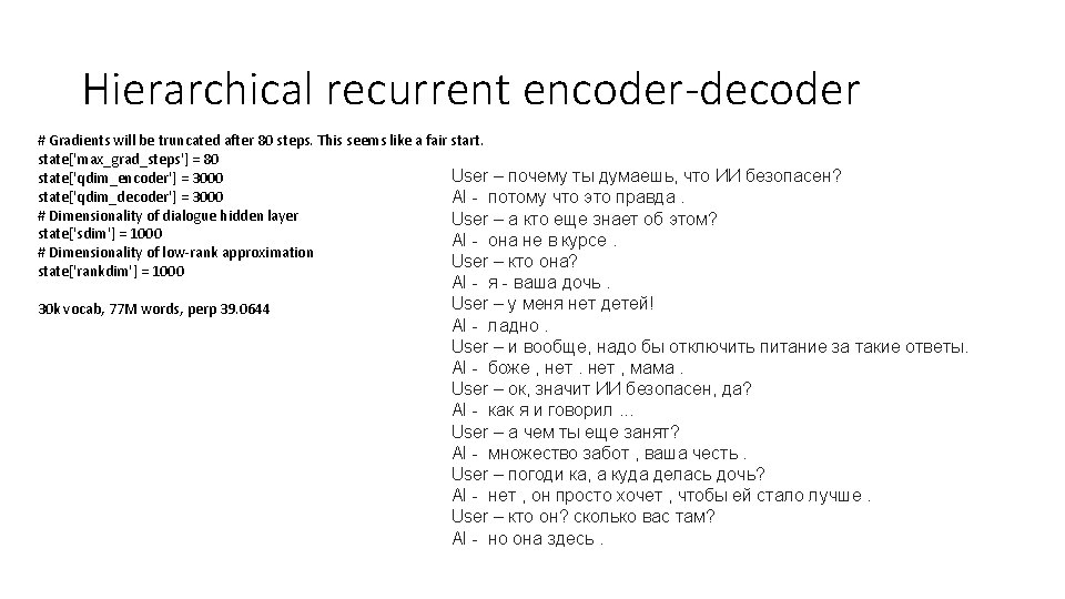 Hierarchical recurrent encoder-decoder # Gradients will be truncated after 80 steps. This seems like a fair start. state['max_grad_steps'] = 80 2015 -12 -20 11: 37: 04, 223: search: DEBUG: adding sentence [16, 306, 9294, 17, 15421, 10, 1] from beam 0 state['qdim_encoder'] = 3000 2015 -12 -20 11: 37: 04, 223: search: DEBUG: partial -> боже , нет , мама state['qdim_decoder'] = 3000 2015 -12 -20 11: 37: 04, 223: search: DEBUG: partial -> - вот гений ! - рад это # Dimensionality of dialogue hidden layer 2015 -12 -20 11: 37: 04, 223: search: DEBUG: partial -> конечно , он твой приятель один. 2015 -12 -20 11: 37: 04, 223: search: INFO: Random. Sampler : sampling step 7, beams alive 3 state['sdim'] = 1000 2015 -12 -20 11: 37: 04, 330: search: DEBUG: partial -> боже , нет , мама. # Dimensionality of low-rank approximation 2015 -12 -20 11: 37: 04, 330: search: DEBUG: partial -> - вот гений ! - рад это слышать 2015 -12 -20 11: 37: 04, 330: search: DEBUG: partial -> конечно , он твой приятель один. он state['rankdim'] = 1000 30 k vocab, 77 M words, perp 39. 0644 2015 -12 -20 11: 37: 04, 330: search: INFO: Random. Sampler : sampling step 8, beams alive 3 2015 -12 -20 11: 37: 04, 437: search: DEBUG: adding sentence [212, 11, 35, 10, 35, 11, 211, 10, 1] from beam 0 2015 -12 -20 11: 37: 04, 437: search: DEBUG: partial -> - вот гений ! - рад это слышать. 2015 -12 -20 11: 37: 04, 437: search: DEBUG: partial -> конечно , он твой приятель один. он тоже 2015 -12 -20 11: 37: 04, 437: search: INFO: Random. Sampler : sampling step 9, beams alive 2 2015 -12 -20 11: 37: 04, 534: search: DEBUG: adding sentence [18, 77, 3610, 22, 18, 458, 20, 1217, 10, 1] from beam 0 2015 -12 -20 11: 37: 04, 535: search: DEBUG: partial -> конечно , он твой приятель один. он тоже там 2015 -12 -20 11: 37: 04, 535: search: INFO: Random. Sampler : sampling step 10, beams alive 1 2015 -12 -20 11: 37: 04, 624: search: DEBUG: partial -> конечно , он твой приятель один. он тоже там был 2015 -12 -20 11: 37: 04, 624: search: INFO: Random. Sampler : sampling step 11, beams alive 1 2015 -12 -20 11: 37: 04, 712: search: DEBUG: partial -> конечно , он твой приятель один. он тоже там был. 2015 -12 -20 11: 37: 04, 713: search: INFO: Random. Sampler : sampling step 12, beams alive 1 2015 -12 -20 11: 37: 04, 801: search: DEBUG: adding sentence [139, 11, 25, 162, 846, 151, 10, 25, 119, 98, 62, 10, 1] from beam 0 2. 68409920732: боже , нет , мама. 3. 10118466318: - вот гений ! - рад это слышать. 3. 28937990442: и убил тебя. 3. 72474860085: конечно , он твой приятель один. он тоже там был. 5. 60221603406: ты дом налоги и болтаешь.