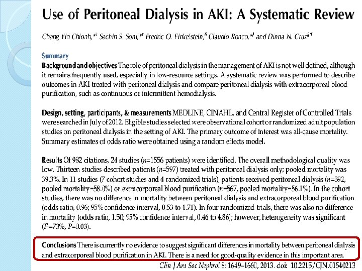 Conclusions ü Data ü The from high quality RCTs are lacking current trend is to provide RRT earlier ü There may be a recovery advantage to using CRRT vs. HD for initial management of AKI but no difference on mortality ü Dose: No benefit to “intensive” therapy Dialytic Support of AKI = Individualization