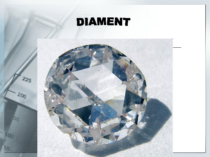 Właściwości diamentu § Symbol chemiczny - C (węgiel) § Układ krystalograficzny - regularny § Twardość w skali Mohsa - 10, najtwardszy ze znanych minerałów § Łupliwość – wyraźna według ścian ośmiościan § Rysa- biała § Przełam - drobnoziarnisty, promienisty § Gęstość– 3, 47 – 3, 57 - najczęściej: 3, 52 g/cm³ § Barwa - bezbarwny lub zawiera przebarwienia związane z zanieczyszczeniem