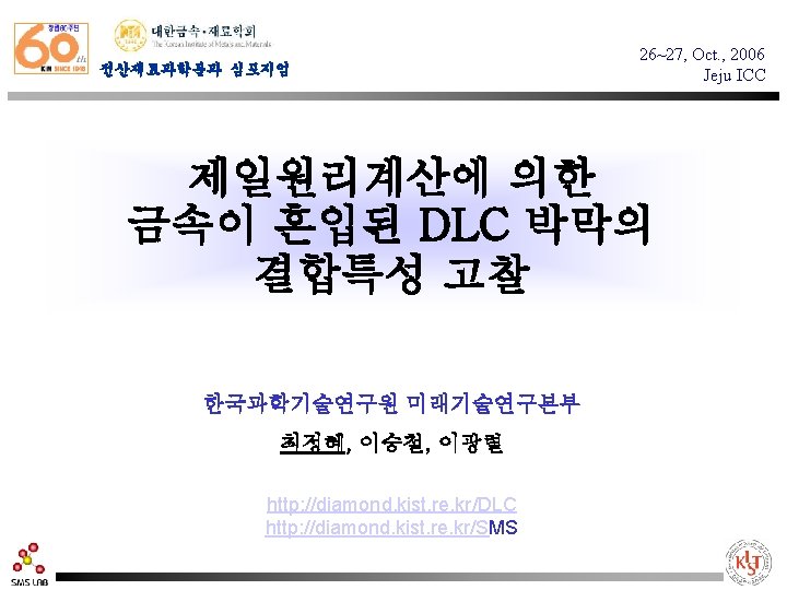 Purpose of this work ≠ 109. 5 o Diamond ; ideal sp 3 bonding DLC ; sp 3, sp 2, sp bonding distorted sp 3 ; primary cause of the residual stress The effect of metal incorporation on the stress reduction atomic bond characteristics ? ? First-principles calculations - the dependency of total energy of the system on the bond angle - the electronic structure and its effects on the stress reduction behavior of a-C films