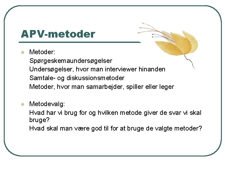APV-metoder l Metoder: Spørgeskemaundersøgelser Undersøgelser, hvor man interviewer hinanden Samtale- og diskussionsmetoder Metoder, hvor man samarbejder, spiller eller leger l Metodevalg: Hvad har vi brug for og hvilken metode giver de svar vi skal bruge? Hvad skal man være god til for at bruge de valgte metoder?