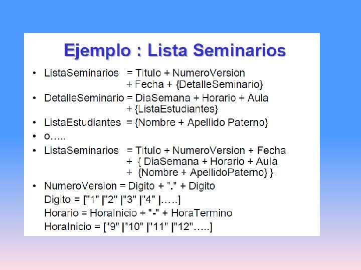 EJEMPLO Nombre = Título + Primer-nombre + Apellido-paterno + Apellido-materno Título = [ Sr | Sra | Dr | Ing] Primer-nombre = {caracter} Apellido-paterno = {caracter} Apellido-materno = {caracter} caracter = [A-Z|a-z| |]