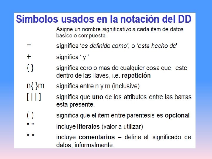 DEFINICIONES Una definición de un dato se introduce mediante el símbolo “=”; en este contexto el “=” se lee como “está definido por”, o “está compuesto de”, o “significa”. Para definir un dato completamente, la definición debe incluir: El significado del dato en el contexto de la aplicación. Esto se documenta en forma de comentario. La composición del dato, si es que está compuesto de otros elementos significativos. Los valores que el dato puede tomar, si se trata de un dato elemental que ya no puede ser descompuesto.