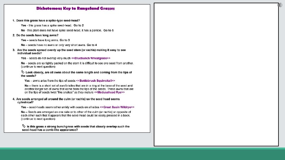 Practice: • Using the “Dichotomous Key to Rangeland Grasses” identify the following grass species (a glossary is also provided so look up any terms you are unfamiliar with). • • Bluebunch Wheatgrass Cheatgrass or Downy Brome Crested Wheatgrass Idaho Fescue If you are having a hard time seeing the physical characteristics, zoom in!
