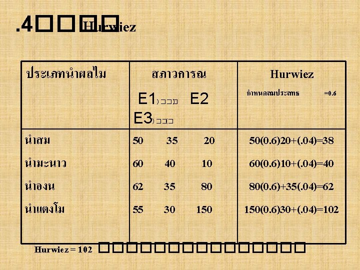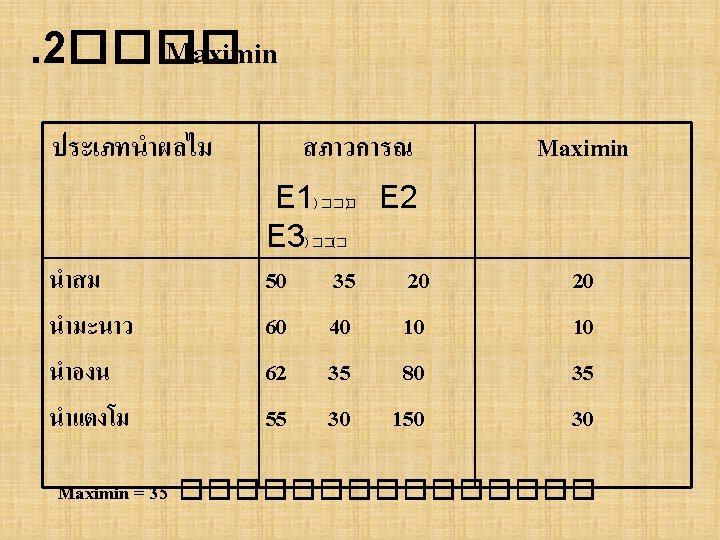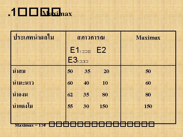 DICISION MAKING 1 Maximax 2 Maximin 3 Mimimax Slides: 19 Download presentation ����� DICISION MAKING ������������. 1 Maximax 2. Maximin 3. Mimimax 4. Hurwiez 5. Lapace 6. Expected Return ��������������. 1 Maximax 2. Maximin 3. Mimimax 4. Hurwiez 5. Lapace 6. Expected Return