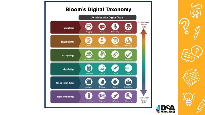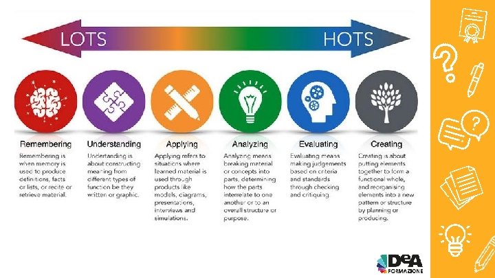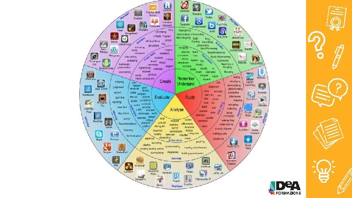 Bloom’s Digital Taxonomy • 1950 Bloom Obiettivi educativi e didattici; • 2001 Anderson e Krathwol revisioni e adattamenti; • 2007 Churchers ulteriore perfezionamento più allineata al XXI secolo; • HOTS (Higher Order Thinking skills) & LOTS (Lower Order Thinking Skills).