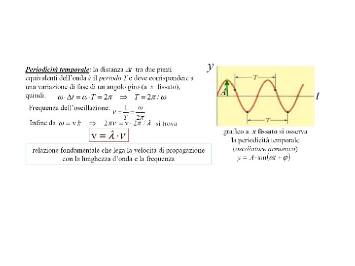 Descrizione matematica di un’onda (in una dimensione) Onda trasversale Asse y: direzione dello spostamento del punto Asse x: direzione di propagazione Ad un certo istante l’onda è descritta da una funzione y = f(x); un certo punto dell’onda (y. M) abbia coordinata x 0 La funzione che descrive in generale l’onda propagante in direzione +x è Dopo un tempo t l’onda si è spostata di v t, e l’ampiezza massima si trova nel punto x 1=x 0+v t, y. M= f(x 0) = f(x 1 - v t) quindi si ha y = f(x – v t) Se l’onda si propaga in direzione x negativa si ha, y = f(x + v t)