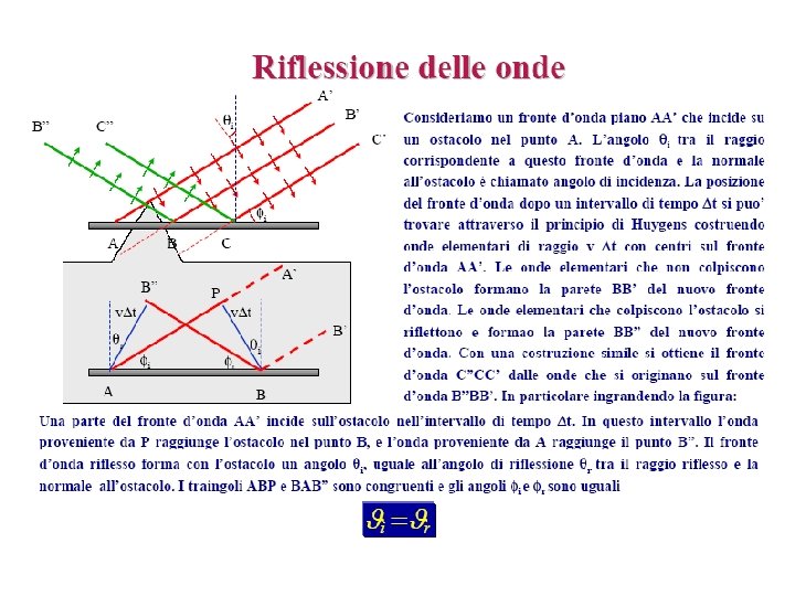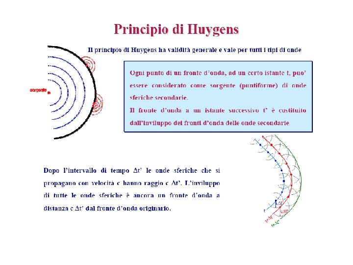 Il fronte d’onda Luogo geometrico dei punti dello spazio che, in un dato istante, è raggiunto dalla perturbazione ondosa generata dalla sorgente ad un ben preciso istante precedente. Fronte d’onda piano: i raggi sono tutti paralleli fra loro Fronte d’onda circolare: la sorgente delle onde è un punto al centro