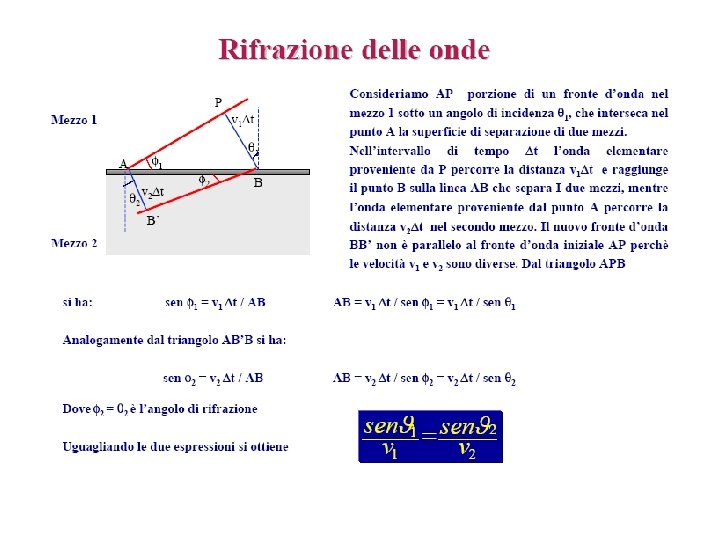 Rifrazione di onde piane in un ondoscopio L’onda piana prodotta, nel passare dalla profondità minore a quella maggiore, modifica la propria lunghezza d’onda. La lunghezza d’onda aumenta nel passare alla zona 2, più profonda della zona 1. Questo significa anche la velocità di propagazione aumenta con la profondità. Se il gradino è inclinato di un certo angolo rispetto all’ eccitatore: osserveremo che la direzione di propagazione dell’onda subisce una deviazione.