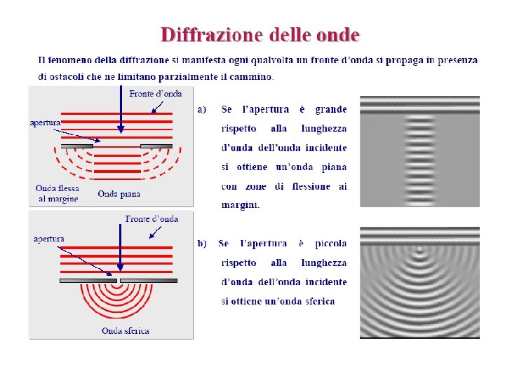La diffrazione Il suono subisce anche il fenomeno della diffrazione; ad esempio, possiamo udire le voci di persone che sono dietro l’angolo di un edificio. Tale fenomeno si verifica quando gli ostacoli contro cui incidono le onde hanno dimensioni confrontabili con la loro lunghezza d’onda. Dal momento che per le onde sonore in aria essa è in genere compresa tra 1, 5 cm e 20 m (che rappresentano le normali dimensioni di mobili o edifici) è evidente qual è il motivo per cui il fenomeno della diffrazione delle onde sonore si verifica abbastanza frequentemente.