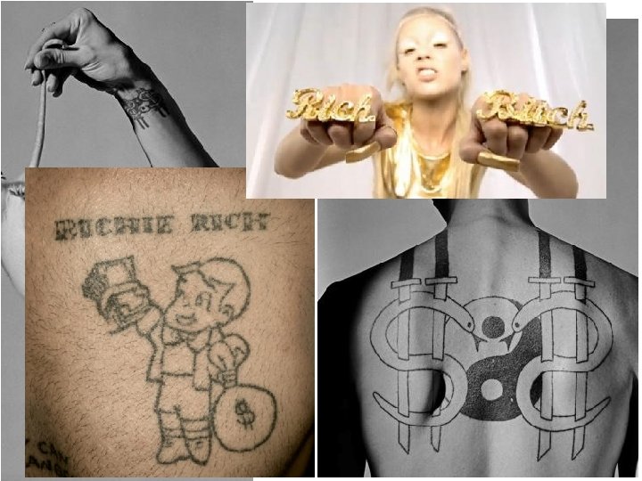 Beheptheid met geld Dit is duidelik dat Die Antwoord behep is met geld. Die tatoeërmerke op Ninja wys dit duidelik. (kyk http: //tattooartistmagazineblog. com/2011/08/10/tyler-murphy-dieantwoord-hand-poked-tattoos-ninja-yolandie-tattoo-artist-magazine -blog/) Ook die “$”-teken in woorde soos “Vi$$er”, en “Ten$ion”.
