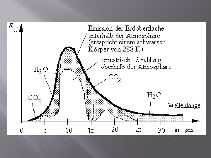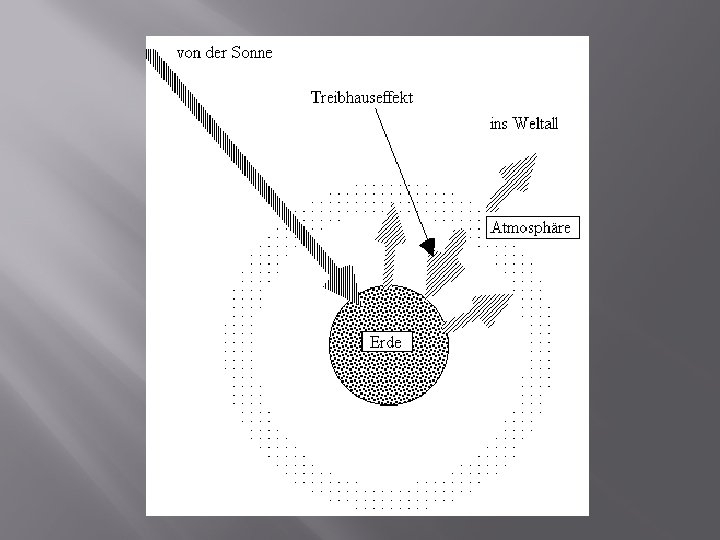 Treibhauseffekt ermöglicht Leben auf der Erde � � � Mittlere Temperatur auf der Erdoberfläche: 288 K (+15° C) Effektive Temperatur im Strahlungsgleichgewicht mit der Sonne: 255 K (— 18° C) Treibhauseffekt +33 K