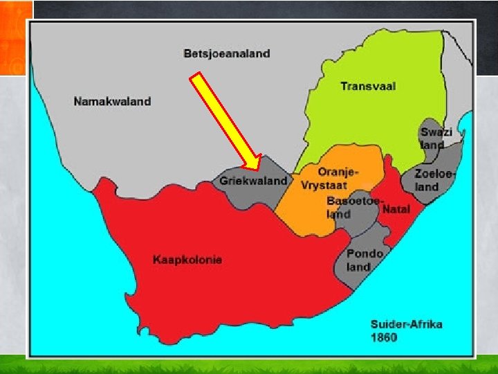 Ontdekking van diamante • Die Griekwas mense van gemengde ras, tussen Nederlandse koloniste in die Kaap en die Khoi en San wat daar gewoon het. • Rassisme in die Kaapkolonie, het die Griekwas gedwing om noordwaarts weg te trek.