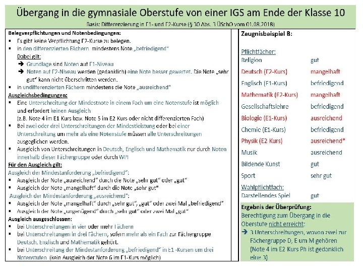 Übergang von einer IGS in die gymnasiale Oberstufe (MSS) (§ 30 Abs. 3 ÜSch. O) Belegverpflichtungen und Notenbedingungen: § Es gibt keine Verpflichtung E 2 -Kurse zu belegen. § in den differenzierten Fächern mindestens Note „befriedigend“ § Dabei gilt: ü Grundlage sind Noten auf E 1 -Niveau ü Noten auf E 2 -Niveau werden (gedanklich) eine Note besser gewertet. Die Note „sehr gut“ kann nicht überschritten werden. § in undifferenzierten Fächern mindestens die Note „ausreichend“