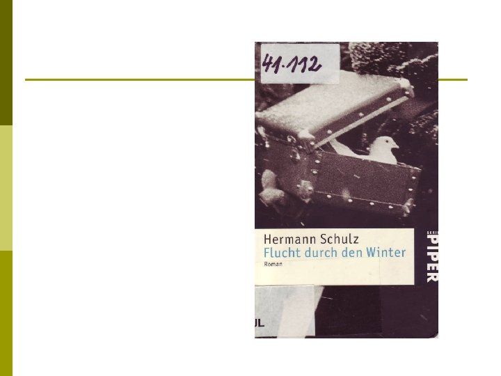 P. Härtling: Reise gegen den Wind p p p 2. Weltkrieg gesehen mit kindlichen Augen; Vertreibung aus Mähren Reise gegen den Wind (2000) Bernd, ein 11 -jähriger deutscher Junge, erlebt das Ende des Krieges bei der Flucht aus Brünn in Laa an der Thaya. Nichts ist in dieser Zeit normal, aber für Primel ist alles wie ein großes, aufregendes Abenteuer. Der Krieg ist vorbei, aber der Schrecken hat noch nicht aufgehört. Viele sind auf der Flucht, alles haben sie verloren. So geht es auch Tante Karla und ihrem elternlosen Neffen, den sie Primel nennt. Auf ihrer Flucht aus Brünn in den Westen sind sie in dem kleinen österreichischen Grenzort Laa an der Thaya gestrandet. Es geht nichts mehr weiter, die Züge fahren noch nicht. Die Tage ziehen sich und Primel beginnt, sich in Laa einzurichten. Die Freundschaft mit Leni und Poldi hilft ihm dabei. Und Hundi, der sich nicht mehr vertreiben lässt. Eines Tages sieht Primel etwas im Wald, was er nicht sehen darf. Und als er von der sowjetischen Militärpolizei streng verhört wird, hilft ihm der fabelhafte Herr Maier aus der Klemme. Niemand weiß genau, wer dieser Herr Maier eigentlich ist.