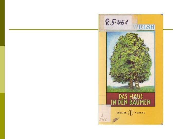 Renate Welsh: Das Haus in den Bäumen. Obelisk Verlag, Wien 1993 p Text vom Umschlag: Eva mag es, wenn die Abendsonne rot durch Peters abstehende Ohren scheint. Sie mag alles an Peter; nur wenn Herr Dreborg, Peters Vater, auf seinem Motorrad anbraust, wird Peter ihr fremd: zaghaft plötzlich und höflich. Doch zum Glück geschieht das nicht oft. Die Erwachsenen sind selten da, in diesen Monaten vor Ende des Krieges. Und so verbringen Eva und Peter endlose Tage in dem verwilderten Garten hinter der Mühle…