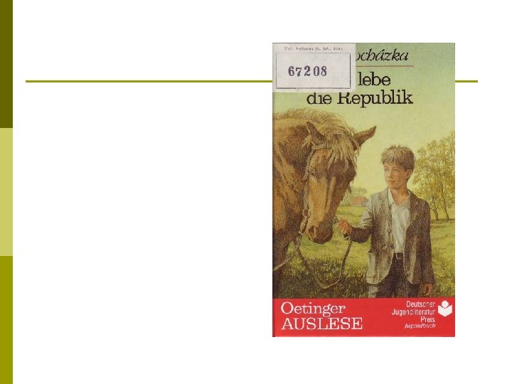 Jan Procházka. Es lebe die Republik. Ich, Julina und das Kriegsende (1966) p p p Verlag Friedrich Oetinger, Hamburg, 1987. Deutsch von Peter Vilimek. Inhaltsangabe (Süddeutsche Zeitung) „Der zwölfjährige Olin erlebt das Kriegsende 1945 in einem mährischen Dorf, er gerät zwischen die abziehenden deutschen Truppen und die anrückenden russischen Befreier. Olin erfährt Gewalt, Willkür und Tod nicht nur als Begleiterscheinung des großen Krieges; auch innerhalb der engsten Dorfgemeinschaft dominieren Rohheit, Besitzgier und das Recht des Stärkeren. Dennoch enthält dieses Buch keine direkte Anklage, es ist ohne Bitterkeit und Resignation, es verletzt nicht. “