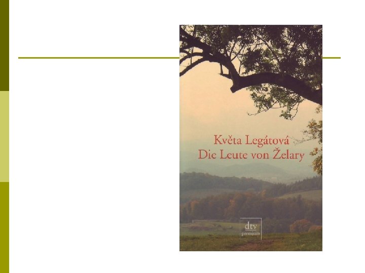 Květa Legátová: Želary (2001) p p p Erwachsenenliteratur Deutsche Fassung: Die Leute von Želary. Deutscher Taschenbuch Verlag, München 2005. Übersetzt von Sophia Marzolff Květa Legátová ist das Pseudonym von Věra Hofmannová (1919 -2013). Während des kommunistischen Regimes galt sie als politisch unzuverlässig und deshalb wurde sie nach dem Studium der tschechischen und deutschen Sprache, der Mathematik und Physik als Lehrerin von einer Dorfschule zur anderen versetzt. Aus den Bergregionen in der Nähe der slowakischen Grenze schöpft sie die Themen für ihre balladenhaften Geschichten. Für das Werk Zelary erhielt sie 2002 den tschechischen Staatspreis für Literatur, die höchste literarische Auszeichnung Tschechiens.