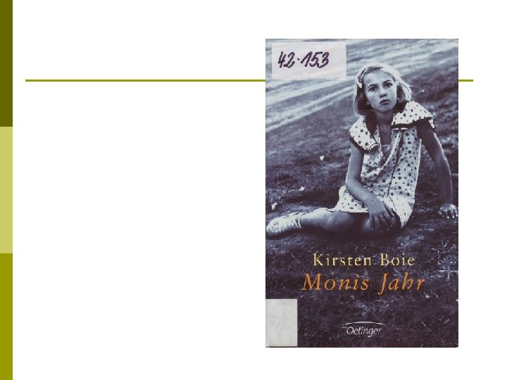 Kirsten Boie: Monis Jahr BOIE, K. Monis Jahr. Hamburg: Verlag Friedrich Oetinger, 2003 p Geboren 1950 in Hamburg. Sie studierte Deutsch und Englisch. Zuerst unterrichtete sie an diversen Schulen. Seit 1983 ist sie freischaffende Kinder- und Jugendbuchschriftstellerin. p
