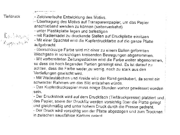 Kaltnadelradierung Vorgehensweise 1. Vorzeichnung (welche die Ausmaße Ihrer Platte hat) unter die Platte legen; Schraffuren und Strukturen mit der kalten Nadel nachziehen 2. Nach dem Probedrucken sind Hinzufügungen möglich, Löschungen nicht! 3. Einmassieren der Tiefdruckfarbe in die Ritzen (Pad) 4. Polieren der überstehenden Farbe (Handballen o. Papiertuch) 5. Getränktes (mit Wasser voll gesogenes, aber trocken gedrücktes Papier) auf die Platte, Ausrichten auf Kanten, damit nicht „schief“ gedruckt wird, Schichten von Zeitungen darauf und… 6. … durch die Tiefdruckpresse ziehen 7. Papier abziehen, zum Glätten zwischen Papier lagern, anschließend zum Trocknen auslegen