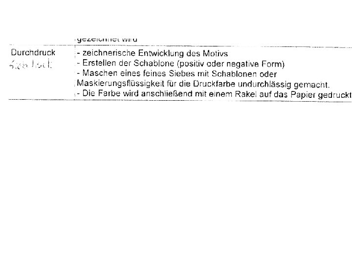 Druckverfahren im fachpraktischen Versuch: 3. Studie anlegen Hochdruck flächig, Pinsel und Ausziehtusche; bei Mehrfarbendruck: farbige Tusche o. Malfarben wie Temp. , Acryl Flachdruck Finelinder, Pinsel u. Tusche, Tiefdruck Ritzung: feine Linien, Tusche und Feder, Fineliner; Ätzung: Bleistifte in verschiedenen Härtegraden für verschiedene Graustufen Durchdruck Grobmaschige Textilien: Gaze o. Sieb