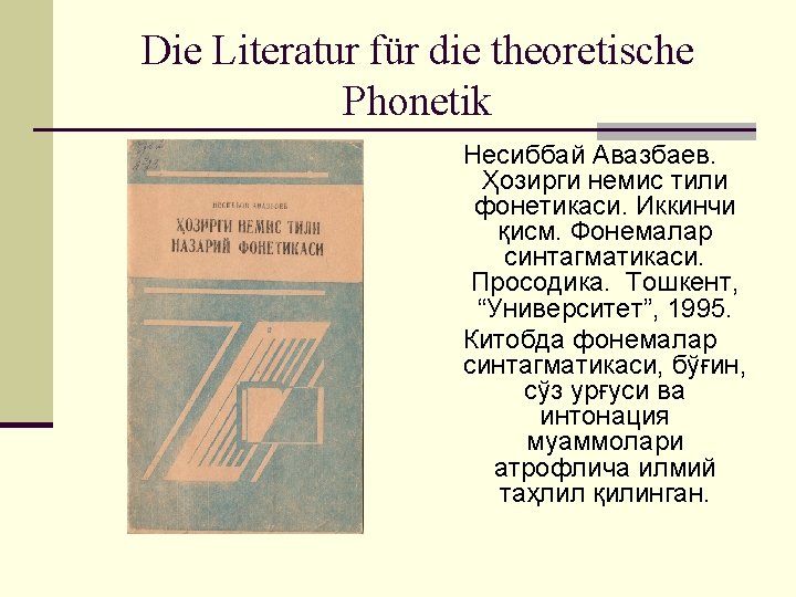 Die Literatur für die theoretische Phonetik N. Awasbajew. Phonetik der deutschen Gegenwartssprache. Тошкент, “Ўқитувчи”, 1978. Lautbildung Phonematik Das Phoneminventar des Deutschen Prosodik Die Satzintonation