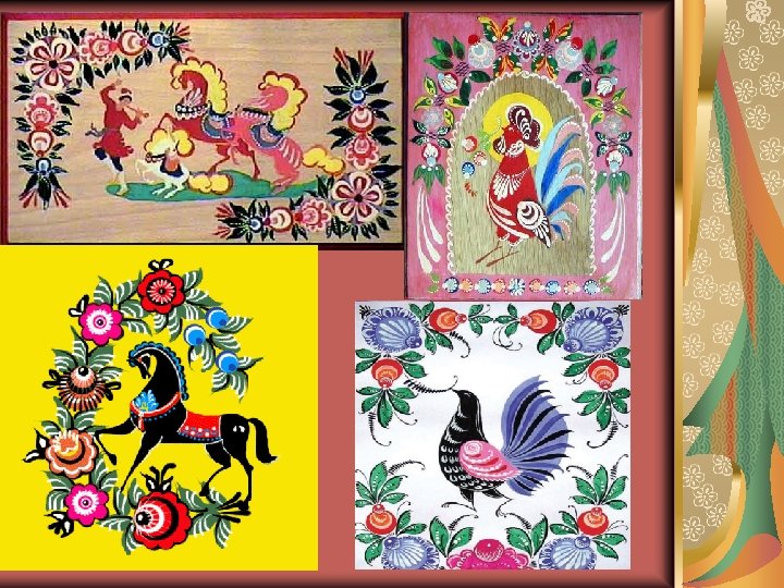 Gorodezmalerei Das russische volkseigene Gewerbe. Es existieren von der Mitte 19 Jahrhunderte in der Stadt Gorodets Nishegoroder Gebit. Die helle, lakonische Malerei schmückte (die genrehaften Szenen, die Figurlein der Pferde, der Hähne, die Blumenmuster) die Spinnrocken, die Möbel, die Laden, die Türe