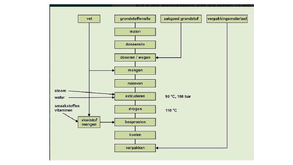 Voerproductie Droogvoer 1. Grondstoffen aanleveren en opslag 2. Malen en mengen 3. 1. Persen en extruderen = het mengsel gaat onder druk door een machine die het mengsel kneedt en samendrukt 2. Expanderen = het mengsel wordt verwarmd maar niet geperst. 4. Drogen 5. Toevoegen extra stoffen (via een coating) 6. Koelen 7. Verpakken