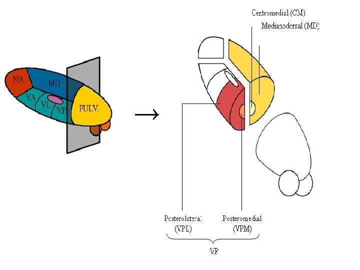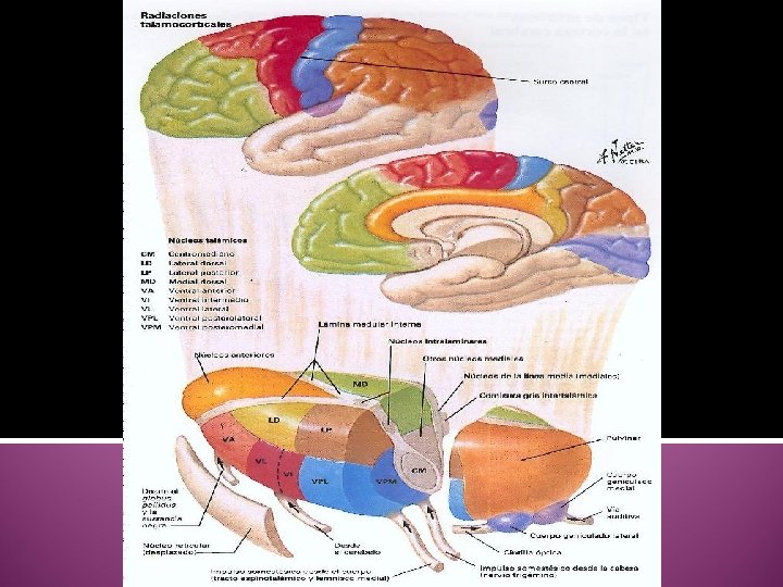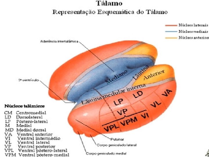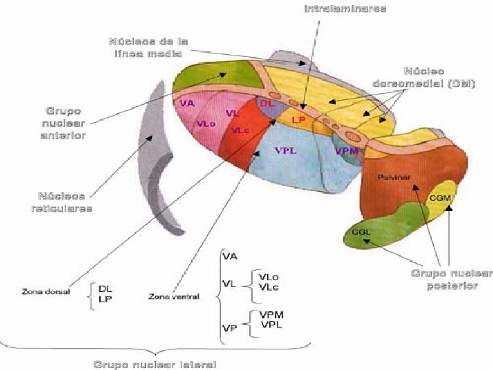 TALAMO - TERRITORIOS 1. Territorio Anterior: Núcleo Anterior (NA) 2. Territorio Ventral: Núcleo Ventral Anterior (VA) Núcleo Ventral Lateral (VL) Núcleo Ventral Posterior(VP): Ventral Posteromedial (VPM) Ventral Posterolateral (VPL)