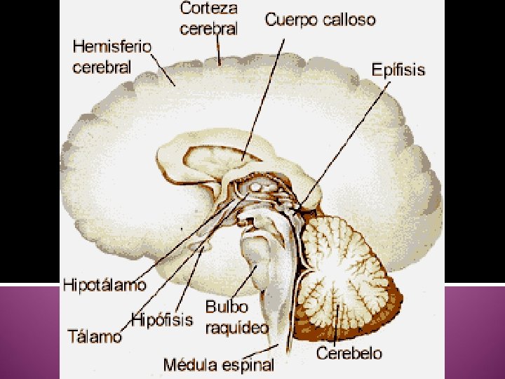 HIPOTALAMO Implicado en: Elaboración de las emociones y sensaciones de dolor y placer En la mujer, controla el ciclo menstrual