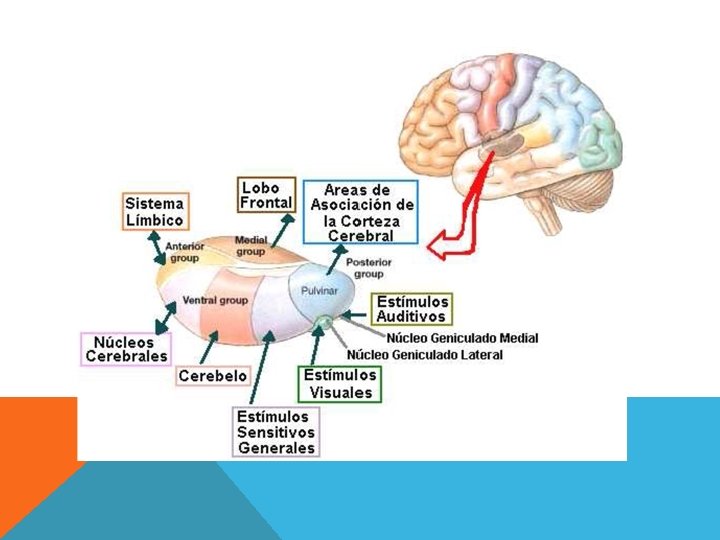 NÚCLEOS DEL TÁLAMO La Zona Posterior del tálamo contiene los siguientes núcleos. Ø Núcleo Pulvinar Ø Núcleo Geniculado Lateral Ø Núcleo Geniculado Medial Los Núcleo Geniculado Lateral y Medial, constituyen el Metatálamo La Zona Laminar del tálamo contiene los siguientes Núcleos Intralaminares. Ø Núcleo Centromediano Ø Núcleo Paracentral Ø Núcleo Parafascicular Ø Núcleo Central Medial y Lateral