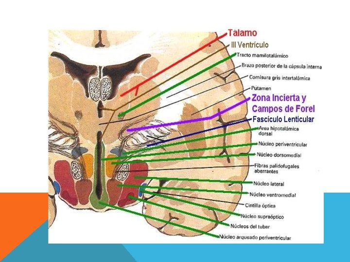 SUBTÁLAMO Ø Tiene tanto un núcleo propio como unos prestados, es decir, que pertenecen a otras zonas, pero que parcialmente ocupan el subtálamo. Ø Núcleo Propio: Núcleo Subtalámico. Ø Núcleos Prestados: Núcleo Rojo y el Núcleo Negro, que son núcleos que pertenecen al pedúnculo cerebral. Ø También tenemos la Zona Incerta, que es el Núcleo Reticular que está lateral al tálamo. Ø La Zona Incerta es una banda de sustancia gris ubicada entre el tálamo y el fascículo Lenticular. Esta estructura, se sabe que recibe conexiones de la corteza cerebral motora primaria, sin embargo, sus eferencias son aún desconocidas.