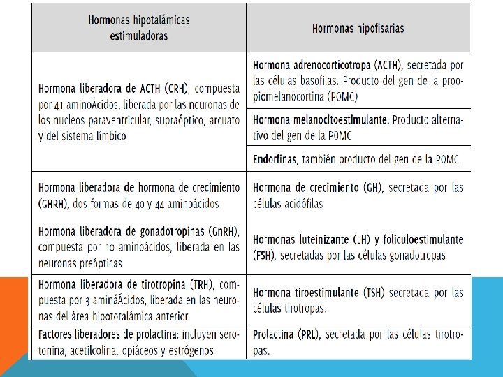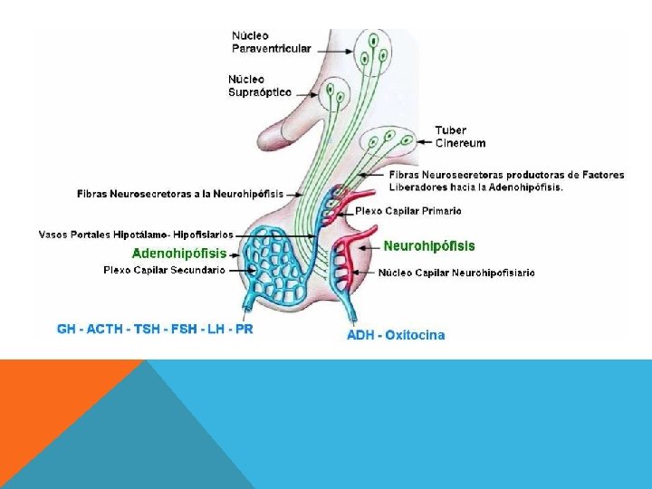 HIPOTÁLAMO Tracto Hipotálamo-Hipofisiario Permite que las hormonas vasopresina y oxitocina, que son sintetizadas por neuronas de los núcleos supraóptico y paraventricular, respectivamente, sean liberadas en los terminales axónicos que contactan con la neurohipófisis. Estas hormonas actúan produciendo vasoconstricción y antidiuresis (vasopresina) o contracción de la musculatura uterina y de las células mioepiteliales que rodean los alvéolos de la glándula mamaria (oxitocina), en la mujer. Sistema porta hipofisiario Está formado por capilares que forman una red que desciende al lóbulo anterior de la hipófisis. Este sistema porta lleva factores de liberación hormonal que son sintetizados en el hipotálamo y cuya acción en el lóbulo posterior de la hipófisis inducirá la producción y liberación de hormonas tales como: adenocorticotrofina (ACTH), hormona folículo estimulante (FSH), hormona luteinizante (LH), hormona tirotrófica (TSH), hormona del crecimiento (GH), etc.
