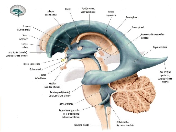 III VENTRÍCULO Es una estructura impar, que se conecta a los ventrículos laterales por el Foramen interventricular. Es atravesado por el Adhesio Intertalámico. Posee diferentes márgenes: Pared medial: Tálamo Techo: Cuerpo Calloso Margen Antero-inferior: esta delimitado por las columnas del Fórnix, comisura anterior, lámina Terminal, quiasma óptico y túber cinereum. Margen Postero–inferior: está delimitado por la comisura posterior y el Cuerpo Pineal. Se observan 4 recesos: Por Posterior: Suprapineal y Pineal Por Anterior: Óptico e Infundibular