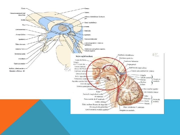 EPITÁLAMO El Epitálamo ocupa una posición dorsal respecto del tálamo e incluye las siguientes estructuras: Estría medular talámica: banda de fibras nerviosas que una dirección dorso medial, hacia el tálamo y une el área septal.