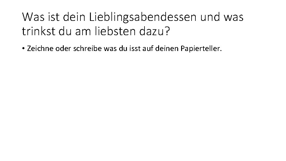 Was ist dein Lieblingsabendessen und was trinkst du am liebsten dazu? • Zeichne oder schreibe was du isst auf deinen Papierteller.