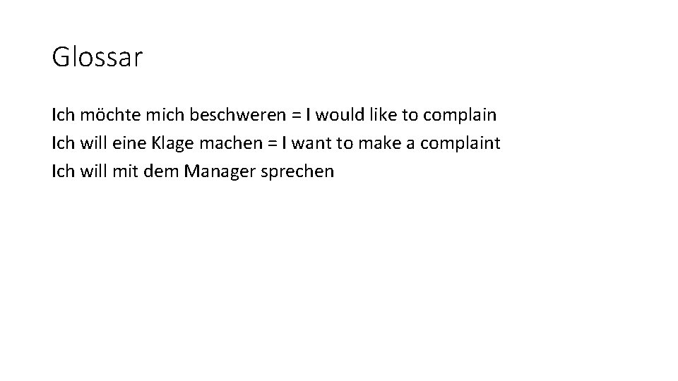 Glossar Ich möchte mich beschweren = I would like to complain Ich will eine Klage machen = I want to make a complaint Ich will mit dem Manager sprechen